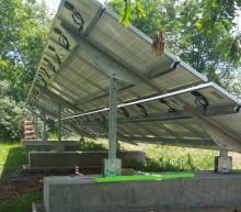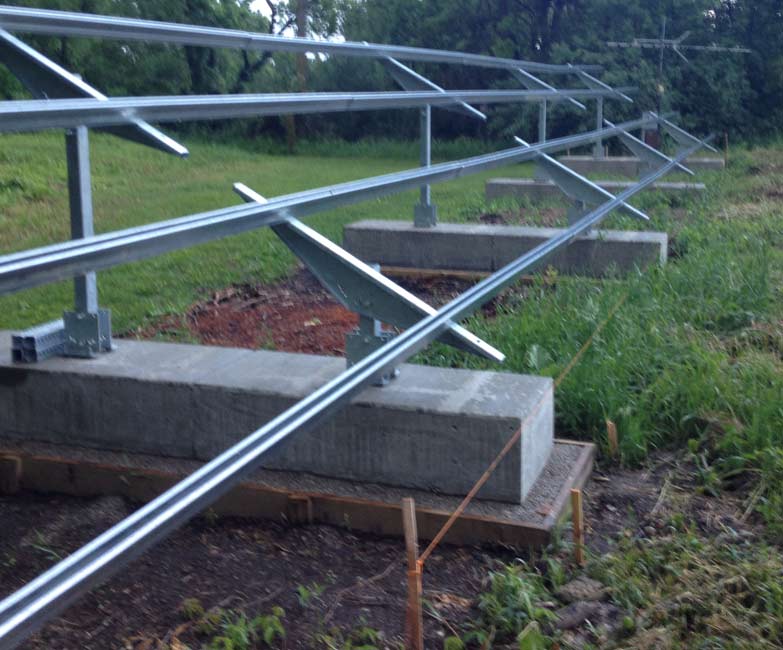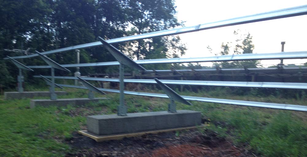- The ground mount array utilized a non-penetrating ballasted design to work with the existing terrain on top of an underground house. To save space in the yard, the North row utilized a longer post to allow closer inner-row spacing.